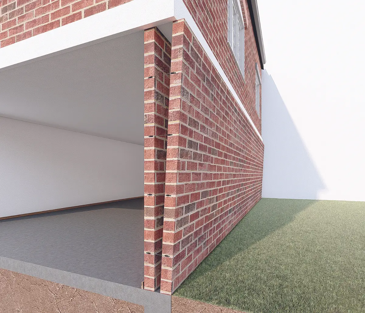 A leaning wall hasn’t failed — it’s lost its connection to the structure behind it. Stainless steel helical ties are drilled through the outer leaf, across the cavity, and dry fixed into the inner leaf. The two walls are reconnected mechanically — the lean is arrested.